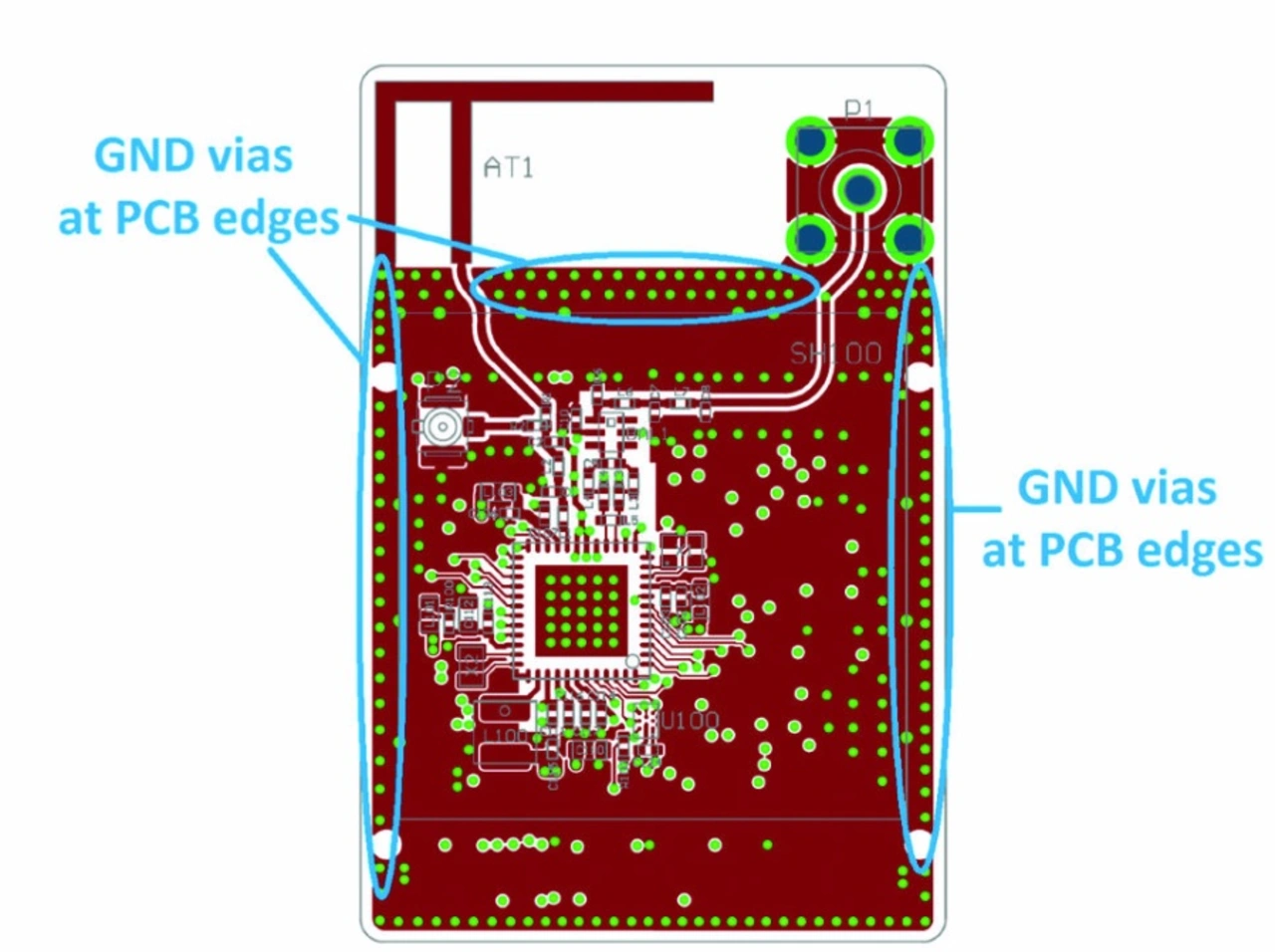 Gängige Praxis ist, dass zumindest eine große durchgehende Masseflächen rund um die Fläche des HF-Bereichs einer Leiterplatte vorhanden ist. Die Leistungsfähigkeit lässt sich steigern, wenn diese Technik auf die gesamte Leiterplatte angewendet wird. Um eine gute HF-Masse zu erhalten, sollten die HF-Spannungspotenziale über die gesamte Masse-Ebene gleich sein. Dies hilft bei der ordnungsgemäßen VDD-Filterung und stellt eine gute Masse-Ebene für Monopol-Antennen bereit. Lücken sollten mit Masseflächen aufgefüllt werden, und die resultierenden Abschnitte auf der oberen und unteren Leiterplattenlage sollten mit so vielen Vias wie möglich verbunden werden.