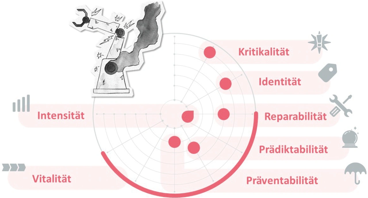 Analysiert man alle Ereignisse eines technischen Systems, so stellt man schnell fest, dass jedes Ereignis spezifische Merkmale und Eigenschaften hat. Diese lassen sich kategorisieren und messen; sie können als eine Art Fingerabdruck des Fehlerereignisses betrachtet werden. Im Folgenden werden beispielhaft Eigenschaften aufgeführt, wie sie seit Jahren in den Branchen Automotive und Maschinenbau verwendet werden. Diese Beispiele (Bild 2) haben keinen Anspruch auf Vollständigkeit; je nach Branche und System können mehr oder weniger Kriterien Berücksichtigung finden.