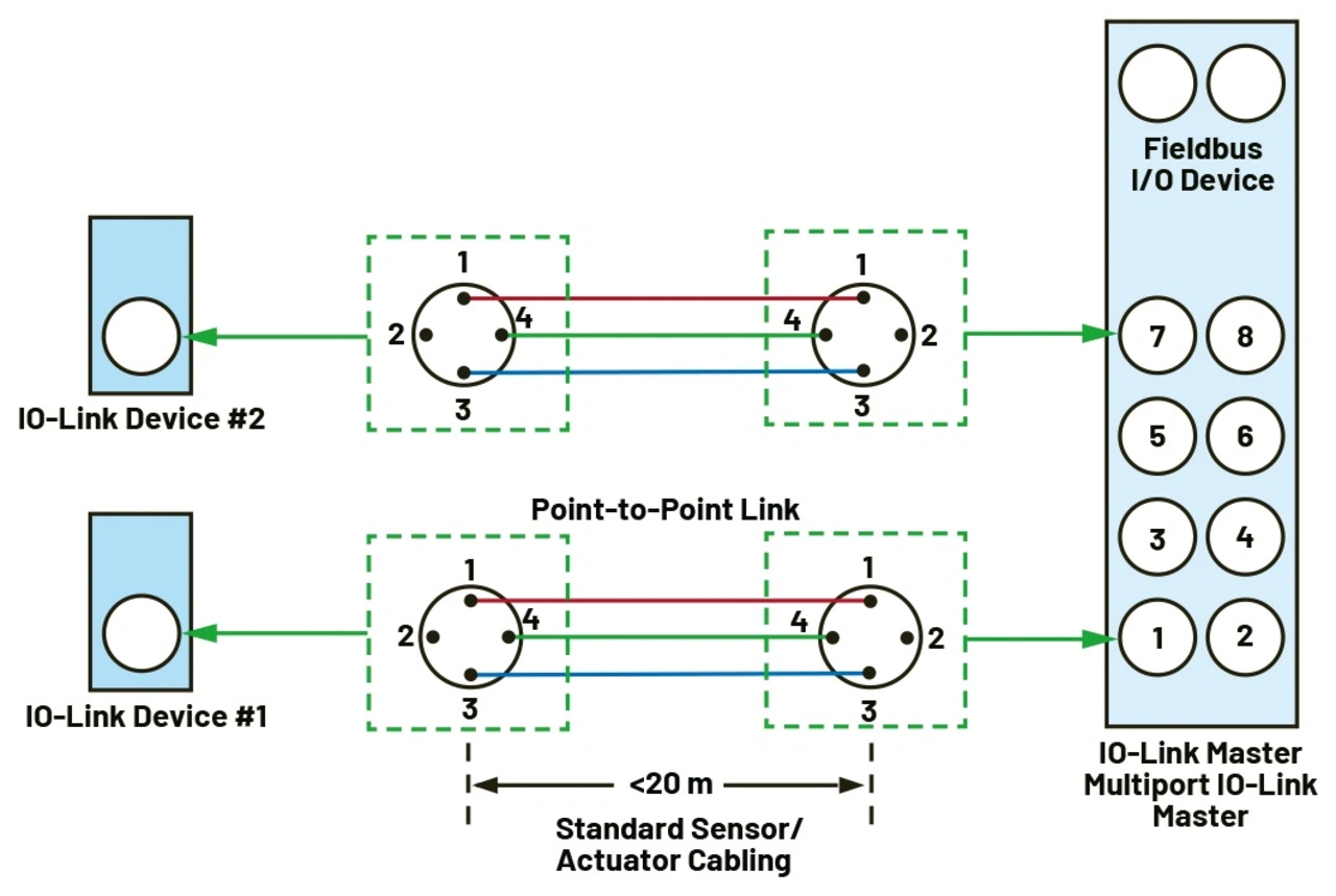 IO-Link ist ein industrieller 24-V-Dreidraht-Kommunikationsstandard, der eine Punkt-zu-Punkt-Kommunikation zwischen industriellen Geräten und einem IO-Link-Master ermöglicht, der wiederum mit Prozesskontrollnetzwerken auf höheren Ebenen kommuniziert.