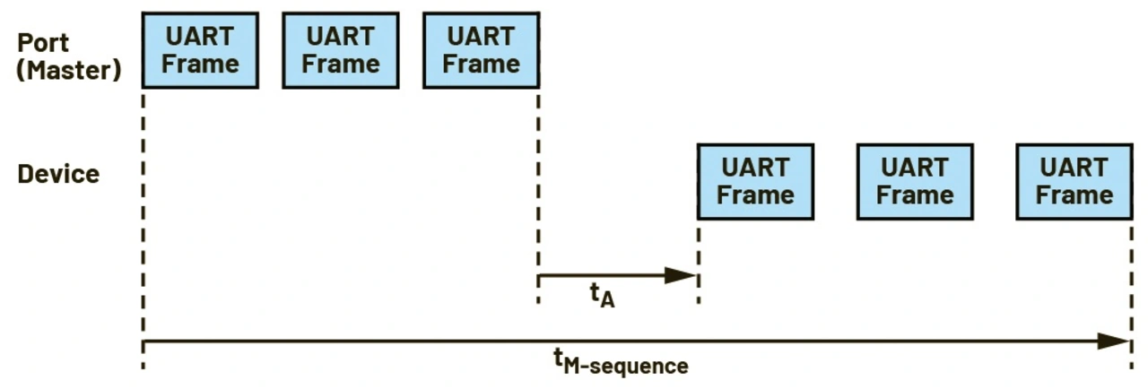 Die Kommunikation zwischen einem IO-Link-Master-Port und einem Device unterliegt mehreren Timing-Einschränkungen und findet sich in einem festen Ablaufplan, M-Sequenz-Zeit, wieder. Eine M-Sequenz-Nachricht enthält einen Befehl oder eine Anforderung (request), die vom IO-Link-Master an ein Device gesendet wird, und die Antwort vom Gerät. Grafik 2 zeigt die Timing-Parameter in einer M-Sequenz, die aus einer Nachricht zwischen einem IO-Link-Master-Port und einer Geräte-Nachricht besteht. Das Gerät muss dabei innerhalb der Antwortzeit des Devices, tA, antworten, die zwischen 1 TBit und 10 TBit (TBit hier = Bit-Zeiten, bit times) dauern kann. Für eine COM3-Baudrate sollte tA zwischen 4,3 µs und 43 µs liegen. Liegt die Antwortzeit außerhalb dieses Bereichs, tritt ein Kommunikationsfehler auf.