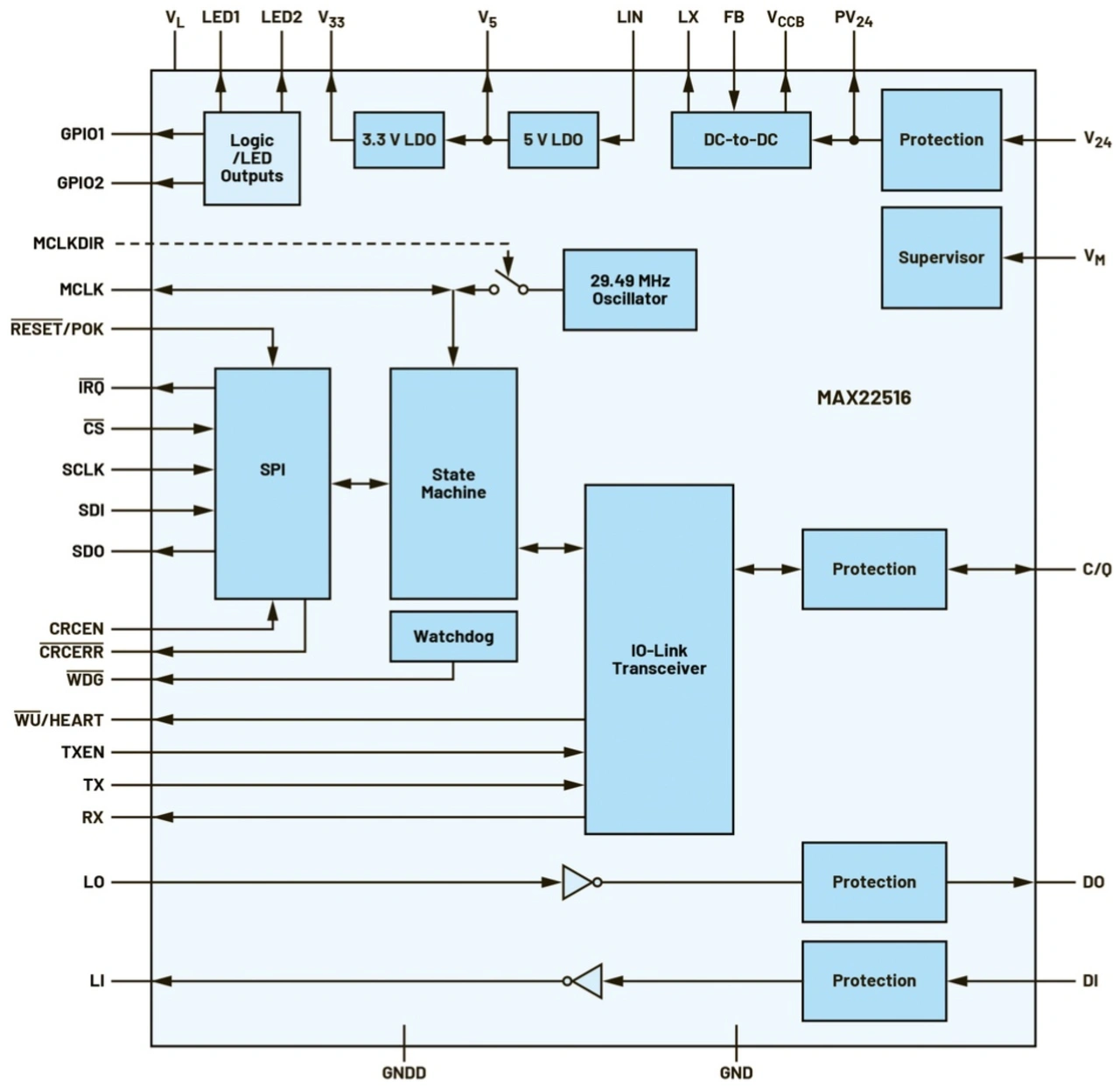 Eine gute Alternative für die Lösung dieses Problems ist es, einen Transceiver zu verwenden, der sowohl den Data Link Layer als auch den Physical Layer im Kommunikationspfad managen kann. Die IO-Link-State-Machine MAX22516 (Grafik 3) integriert alle diese Funktionen, die man üblicherweise in IO-Link-Geräte-Transceivern findet, einschließlich des 24-V-C/Q, eines integrierten DC/DC-Abwärtswandlers sowie 5-V- und 3,3-V-Linearreglern.