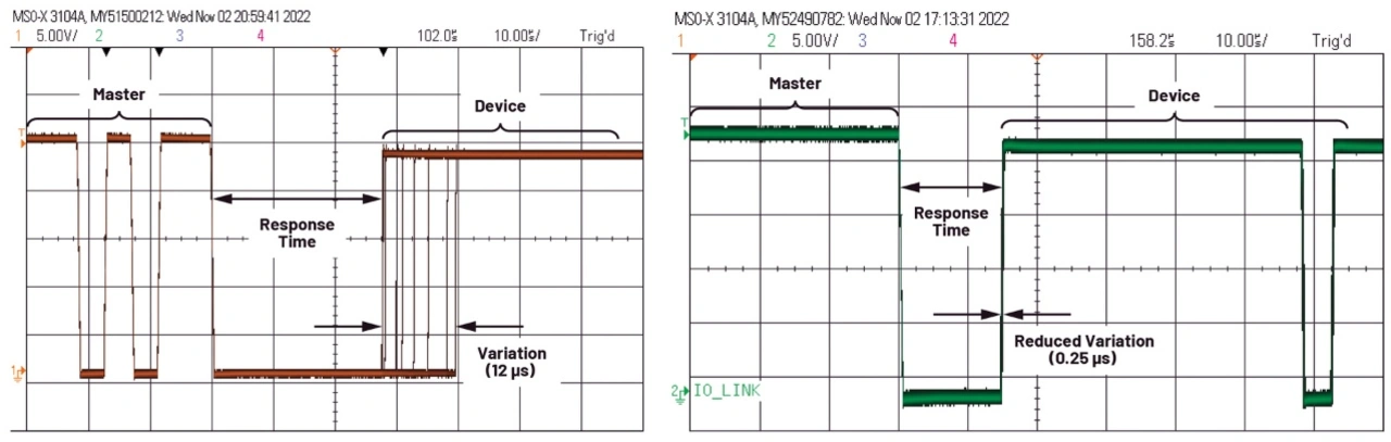 Grafik 4 zeigt, wie der Einsatz des Transceivers die Zeit drastisch reduziert, die ein Gerät benötigt, um auf einen IO-Link-Master zu reagieren, und im Vergleich dazu die Zeit in einer Anwendung, die nur einen einzigen Mikrocontroller verwendet. Die Antwortzeit des Geräts wird um über 50 Prozent und die Schwankungsbreite von 12 µs auf 0,25 µs ebenfalls deutlich reduziert.