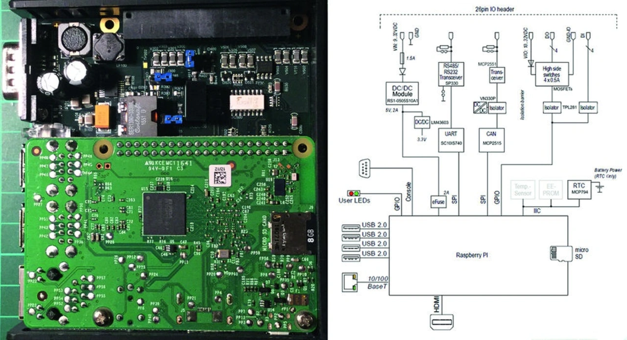 Der UART wird, wie der CAN-Controller (MCP2515 von Microchip), über eine SPI-Schnittstelle des Raspberry Pi angesteuert. Das CAN-Interface ist gegenüber den Ports des Raspberry Pi mithilfe eines Halbleiterrelais (VN330P von STMicroelectronics) optoisoliert aufgebaut. Ebenfalls optoisoliert sind die vier digitalen Ausgänge und die vier digitalen Eingänge, die bis zu 24 V mit 0,5 A vertragen. Hierfür werden zwei Vierfach-Fotokoppler (TLP281 von Toshiba) eingesetzt. Zur Signalisierung von Statusmeldungen sind zwei Leuchtdioden (User LEDs) vorhanden, die direkt vom GPIO-Port gesteuert werden.