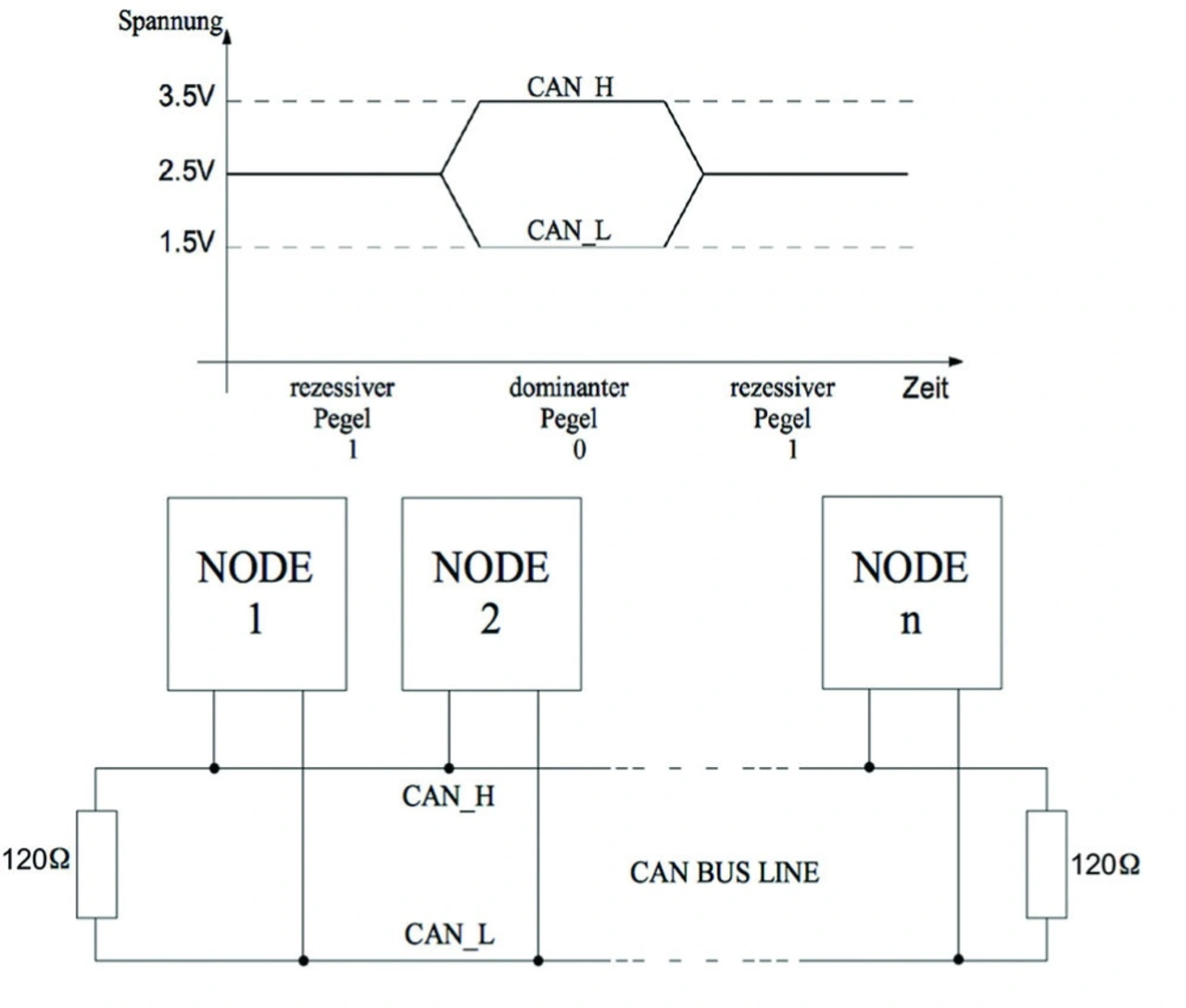 Jeder CAN-Bus-Teilnehmer ist gleichberechtigt und wird mithilfe von zwei differentiellen Leitungen (CAN High, CAN Low), die meist als verdrilltes TP-Kabel ausgeführt sind, an den Bus angeschlossen (Bild 3). Dieser ist an den beiden Enden typischerweise mit jeweils 120 O zu terminieren, d. h. das jeweils letzte Gerät am Bus muss diese Terminierung sicherstellen.