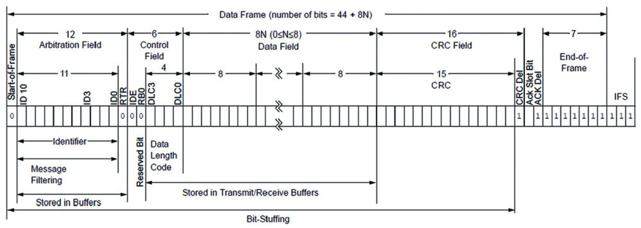 Auf dem CAN-Bus werden verschiedene Datenrahmen übertragen, die stets mit einem SOF-Bit (Start Of Frame) beginnen. Befindet sich das CAN-Bussystem im Ruhemodus (Idle), kann prinzipiell jeder Knoten eine Nachricht aussenden. Aufgrund der gleichberechtigten Teilnehmer gibt es keine Master-Slave-Struktur, sodass ein Zugriffsverfahren (Arbitrierung) regeln muss, welcher Teilnehmer gerade auf den CAN-Bus zugreifen darf. Hierfür ist das Arbitration-Field zuständig, das sich im Standard-Datenrahmen (Bild 4) aus elf Identifier-Bits und einem RTR-Bit (Remote Transmission Request) zusammensetzt.