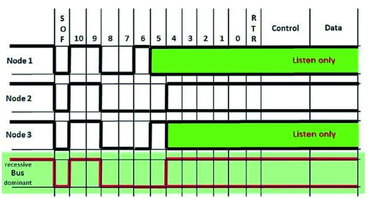 Setzen mehrere Knoten Bits im Arbitration-Field, werden die einzelnen Identifier-Bits an der jeweils gleichen Stelle miteinander verglichen. Der dominante Zustand überschreibt den rezessiven Zustand. Sobald ein Knoten einen dominanten Zustand registriert, obwohl er selbst einen rezessiven Zustand erzeugt hat, wird der Sendeversuch abgebrochen und der Knoten wartet (Listen only, Bild 5), bis die Übertragung abgeschlossen und der Bus wieder im Idle-Modus ist. Danach kann ein erneuter Zugriffsversuch initiiert werden. Dabei sind nicht die einzelnen Knoten mit einer ihr eigenen ID versehen, sondern jeweils die gesendeten Nachrichten. Über dieses Zugriffsverfahren lassen sich die Nachrichten anhand der Werte in den Identifier-Bits außerdem priorisieren.