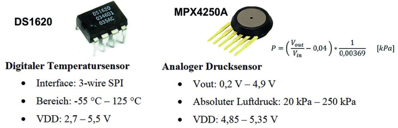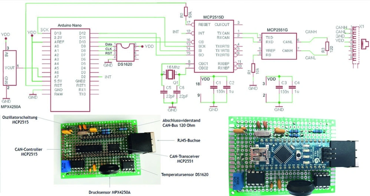 In der Applikation verwendeten wir ein Arduino-Nano-Board als steuernden Mikrocontroller, der mit seiner Platine hucke-pack auf eine Lochrasterplatine gesetzt wird, welche die Elektronik des CAN-Busses und die Sensoren enthält. Für diesen Prototyp wurden beispielhaft ein digitaler Temperatursensor DS1620 von Maxim Integrated und als analoges Bauelement ein Drucksensor vom Typ MPX4250 von NXP (Bild 7) eingesetzt, die an die digitalen Pins D7 bis D9 bzw. an einen analogen Eingang (A7) des Arduino Nano angeschlossen werden.