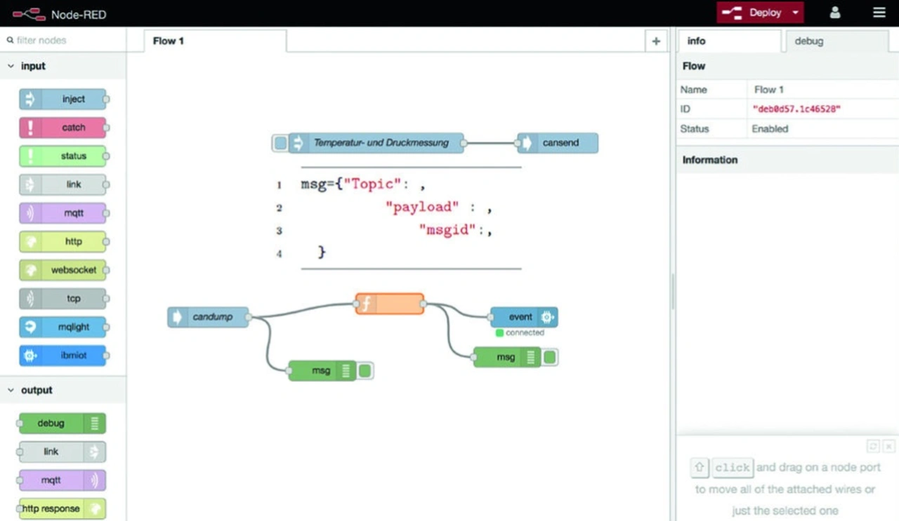 Die auf der linken Seite der Oberfläche (Bild 8) vorhandenen Knoten werden einfach per Mausklick in das Editor-Fenster gezogen. Sie haben – je nach Typ – verschiedene Eigenschaften, wobei das Prinzip stets das Gleiche ist: Daten fließen in einen Knoten hinein, werden verarbeitet und wieder ausgegeben. Durch die Verbindungen der Knoten werden Datenströme bzw. Flows visualisiert. Weil Node-RED auf Node.js und somit auf JavaScript basiert, werden die Daten im Rahmen eines JSON-Objektes (JavaScript Object Notation) übermittelt. Das Objekt heißt in der Regel msg und hat in seiner Grundform die Eigenschaften msgid, topic und payload. Die Message-ID lässt sich dem Objekt zuweisen und wird automatisch erstellt, die Eigenschaft topic hingegen kann selbst gewählt werden, muss aber über keinen Inhalt verfügen, und die Nutzdaten liegen unter der Eigenschaft payload vor.