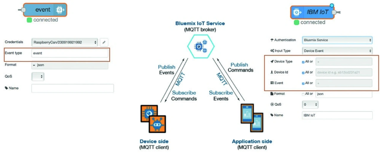 Die Kommunikation zwischen dem Raspberry Pi und der Bluemix-Cloud von IBM findet mithilfe von MQTT (Message Queuing Telemetry Transport) statt, was seit 2013 als das Standardprotokoll für das IoT gilt und deshalb auch Node-RED einsetzt. Grundsätzlich sendet hier ein Publisher (z. B. ein Sensorknoten) seine Daten nicht direkt an einen Empfänger (Subcriber), sondern an einen Server, der als sogenannter Broker (Vermittler) fungiert, die Daten speichert und sie auf Anforderung an Endgeräte wie Computer oder Smartphones überträgt. Im Prinzip kann jeder Client – sei es eine Sensor-/Aktorschaltung oder ein Smartphone – zeitweilig Publisher oder Subscriber sein, der Daten mit dem Broker austauscht. Dieser wird vom Bluemix-IoT-Service (Bild 9) gebildet. Der Nachrichtenaustausch sowie die Klassifizierung und Filterung der Daten erfolgen dabei über Zeichenketten (Topics), die in ihrer Struktur dem Aufbau von Internet-Links ähnlich sind.