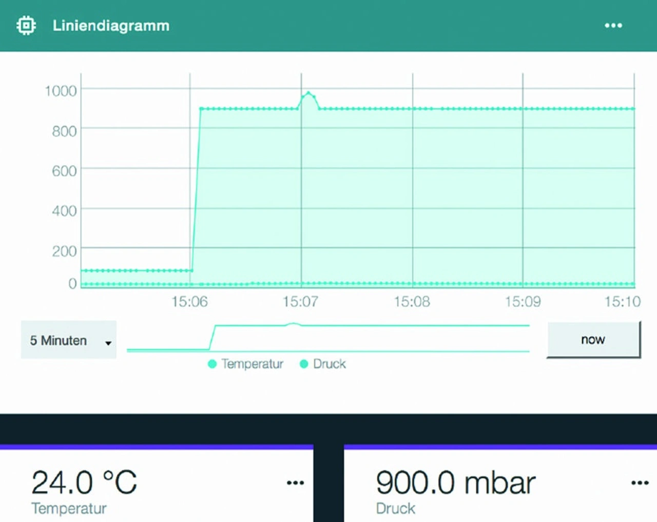 Für die Visualisierung der Daten sind im Boards-Menü verschiedene Möglichkeiten wie etwa generische Visualisierung, Liniendiagramm, Balkendiagramm oder auch Ringdiagramm zu finden. Die hierfür auszuwählende Datenquelle entspricht dem registrierten Knoten. Die Payload des ankommenden Objektes setzt sich aus Temperatur, Druck und Zeitstempel zusammen, was sich in einem Liniendiagramm darstellen lässt (Bild 13).