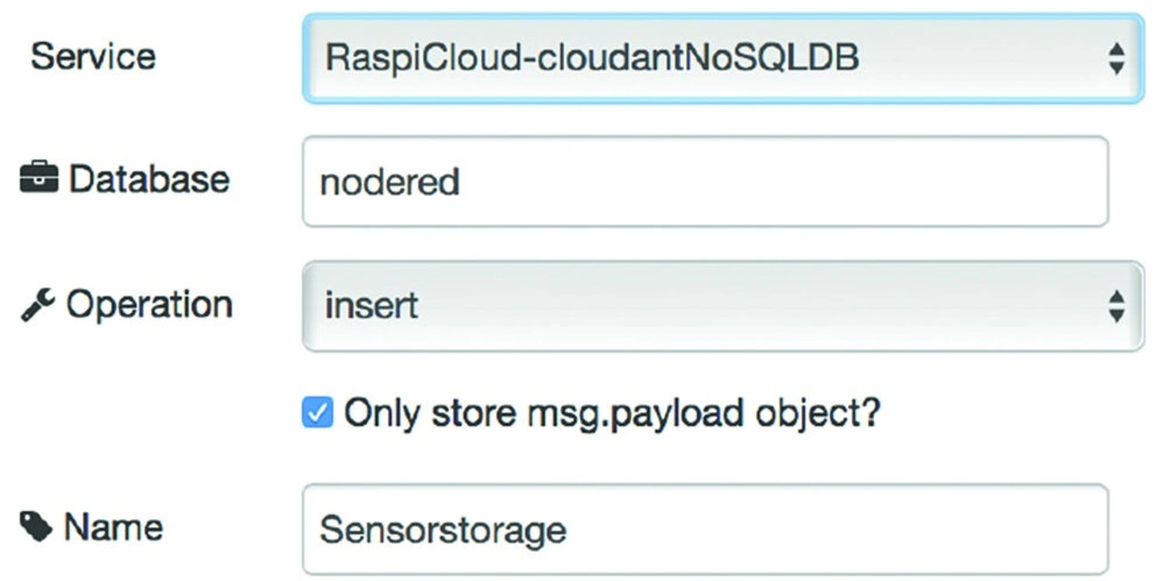 Die Sensordaten werden mithilfe des Datenbankservice (Cloudant) zudem gespeichert und lassen sich später als Historie anzeigen. Hierfür ist ein Cloudant-Knoten in den Node-RED-Editor zu ziehen und mit dem IBM-IoT-Knoten zu verbinden. Die JSON-Objekte mit den Sensordaten im Payload werden direkt an den Cloudant-Knoten übergeben. Die Konfigurierung ist dabei recht einfach (Bild 14): Unter Service wird die Bezeichnung der Anwendung angegeben, unter welcher der Service gestartet wurde. Die Datenbank selbst wird hier nodered genannt. Der Cloudant-Service, über den man auf alle angelegten Datenbanken zugreifen kann, ist dann im Dashboard zu starten. Die empfangenen JSON-Objekte werden hier auch als solche gespeichert, und jedem Objekt wird eine eindeutige ID zugewiesen, über die es sich wieder abrufen lässt.