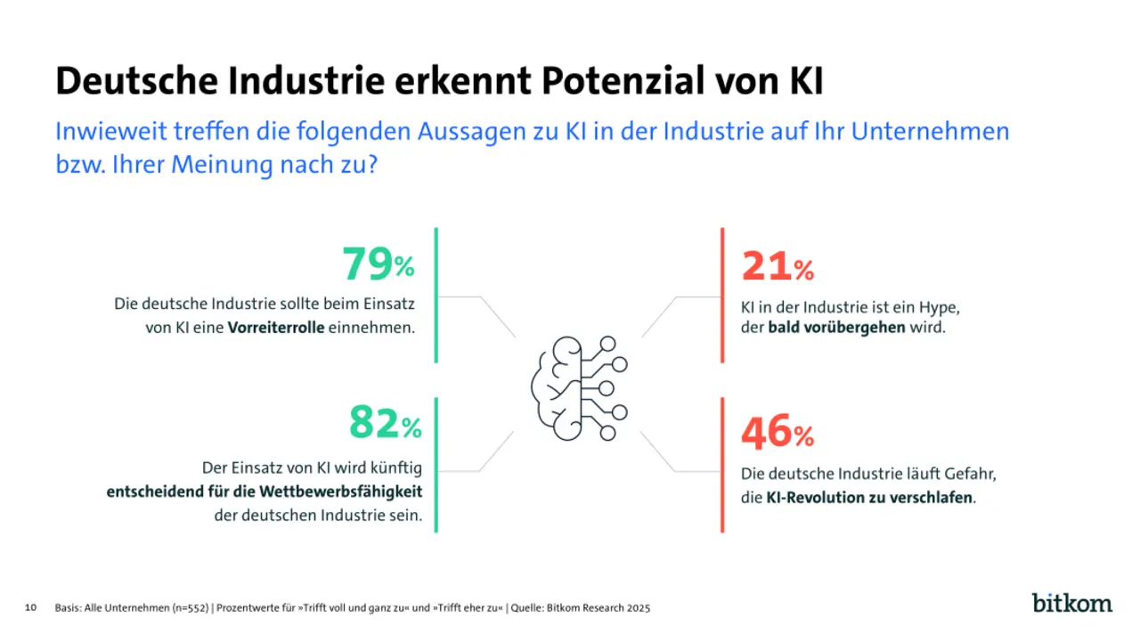 Schon 42 Prozent aller Fertiger setzen laut einer Bitkom-Studie auf KI in ihrer Produktion, ein weiteres Drittel plant entsprechend. Und obwohl fast alle Unternehmen wissen, dass KI den Wettbewerb entscheiden wird, fürchtet fast die Hälfte, dass die deutsche Industrie die KI-Revolution verschläft.