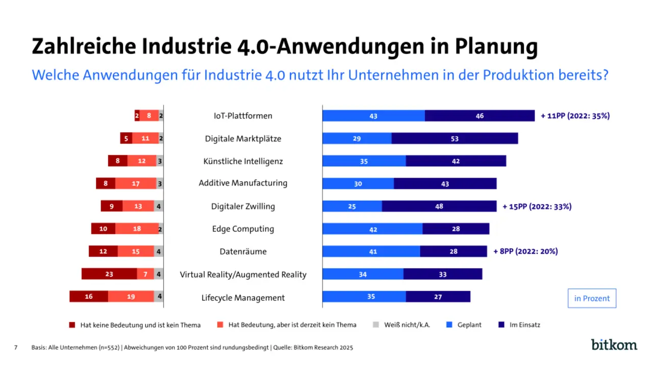 Auch digitale Zwillinge, also virtuelle Modelle von Prozessen, Produkten oder ganzen Fertigungsanlagen sind inzwischen vermehrt im Gebrauch: Knapp die Hälfte (48 Prozent) der deutschen Industrieunternehmen gibt an, entsprechende Anwendungen zu nutzen. Additive Manufacturing, auch bekannt als 3D-Druck, ist nach eigenen Angaben bisher bei 4 von 10 in Anwendung (43 Prozent), Virtual oder Augmented Reality werden bei einem Drittel genutzt (33 Prozent). Edge Computing und Datenräume mit jeweils 28 Prozent sowie Lifecycle Management mit 27 Prozent sind derzeit noch am seltensten – allerdings hat die Verbreitung von Datenräumen in den letzten drei Jahren mit einer Erhöhung um 8 Prozentpunkte bereits Fahrt aufgenommen (2022: 20 Prozent).