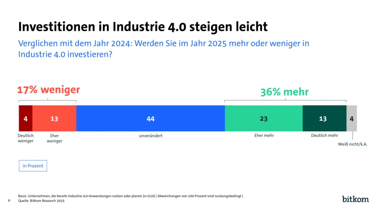 Für die nähere Zukunft sind trotz allem größere Investitionen in Sicht: Denn ungeachtet der Rezession wird im Schnitt in diesem Jahr eher genauso viel oder mehr in Industrie 4.0 investiert als im Vorjahr. Im Vergleich zu 2024 will nur etwa ein Sechstel (17 Prozent) der Industrieunternehmen die Investitionen in Industrie 4.0 senken, während etwa ein Drittel (36 Prozent) plant, sie zu erhöhen: Ein knappes Viertel will dabei eher mehr investieren (23 Prozent), 13 Prozent sogar deutlich mehr. 44 Prozent wollen ihr Investitionsvolumen für 2025 stabil auf dem gleichen Niveau belassen wie in 2024. »Digitalisierung gibt es nicht zum Nulltarif – bei einem Großteil der Industrieunternehmen ist dies angekommen«, sagt Raab.
