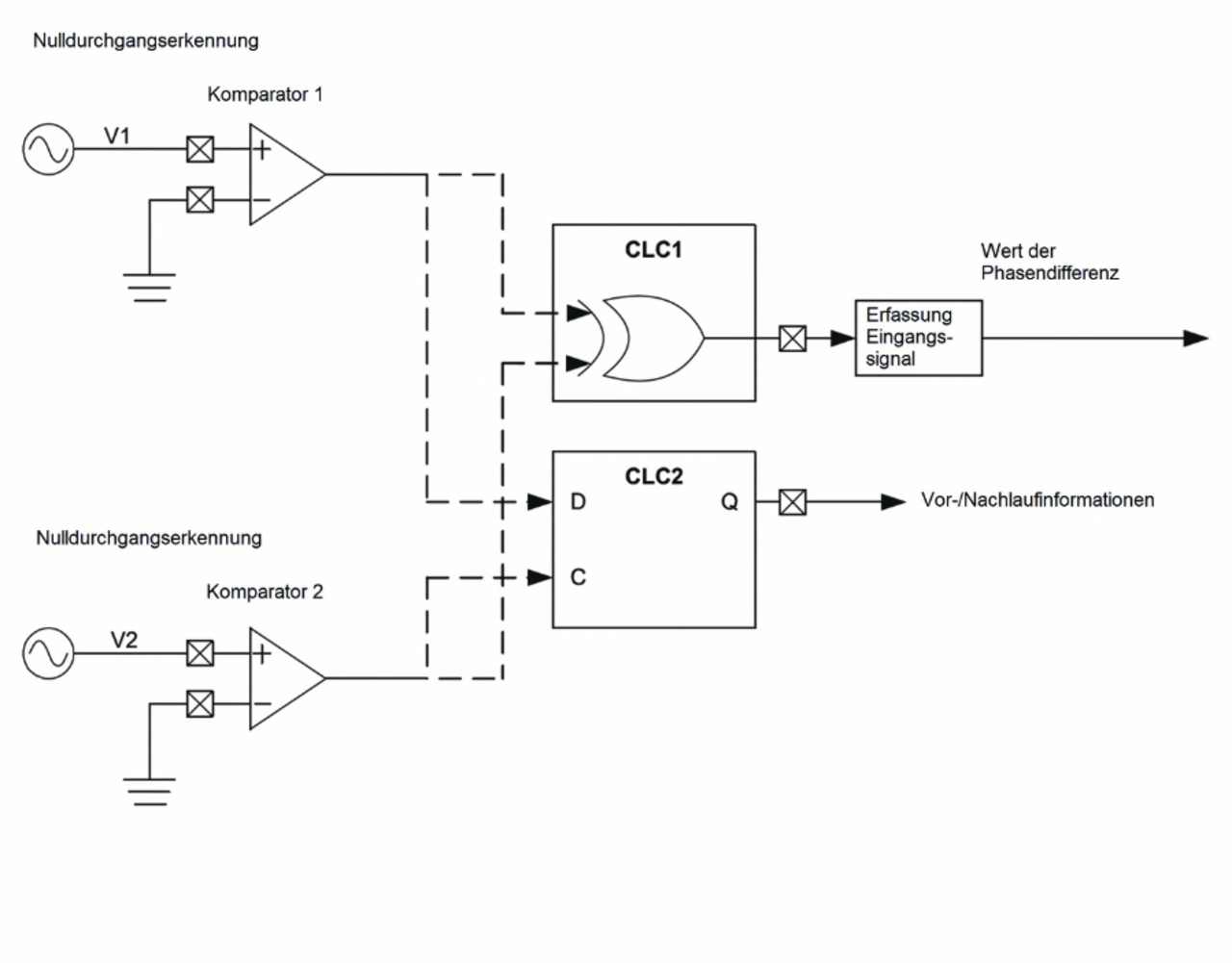 Um die Vor-/Nachlaufinformation der zwei Eingangswellenformen zu ermitteln, wird die CLC in einem D-FF-Modus konfiguriert, wobei eine Rechteckwelle als D-Eingang und die andere als Taktsignal verwendet werden. Der High- bzw. Low-Zustand am Ausgang von CLC2 signalisiert, ob das D-Eingangssignal in Bezug auf den Clock-Eingang phasenmäßig vor- oder nachläuft. Eine Messung des Phasenwinkels zwischen zwei Signalen der gleichen Frequenz ist für viele Anwendungen nützlich, so zum Beispiel bei Energiezählern, digitalen Stromversorgungen, in der Kommunikationstechnik sowie bei medizinischen Instrumenten.
