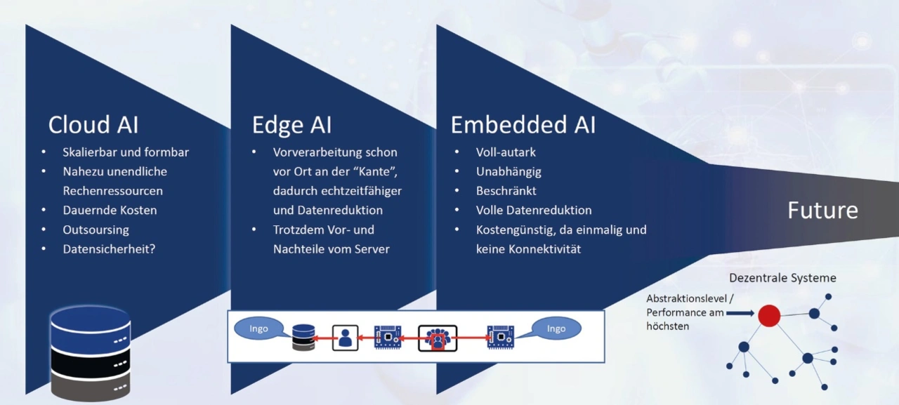 Embedded-KI ist ein neuer Megatrend innerhalb der KI-Technologie-Familie, der sich seit wenigen Jahren aufgrund der Autarkie, der Kosten, der Verarbeitungstiefe und der Nachhaltigkeit in Anwendungen etabliert. Bisher bestand das Problem, dass für KI stets große Rechenkapazitäten nötig sind. Nun sind diese Kapazitäten wegen der Weiterentwicklung der Halbleiter (siehe Moore’s Law) auch direkt vor Ort im Sensor bzw. im Produkt vorhanden. Dieser Megatrend ist also nichts anderes als der Trend zur Dezentralisierung, adäquat zu Vorbildern in der Natur. Es wird immer große KIs auf Servern in Rechenzentren geben, aber in Koexistenz mit Edge-AI und Embedded-AI, verteilt auf Aufgabengebiete, Abstraktionsstufen, Reaktionszeiten und Datentiefen bzw. Datenbreiten.