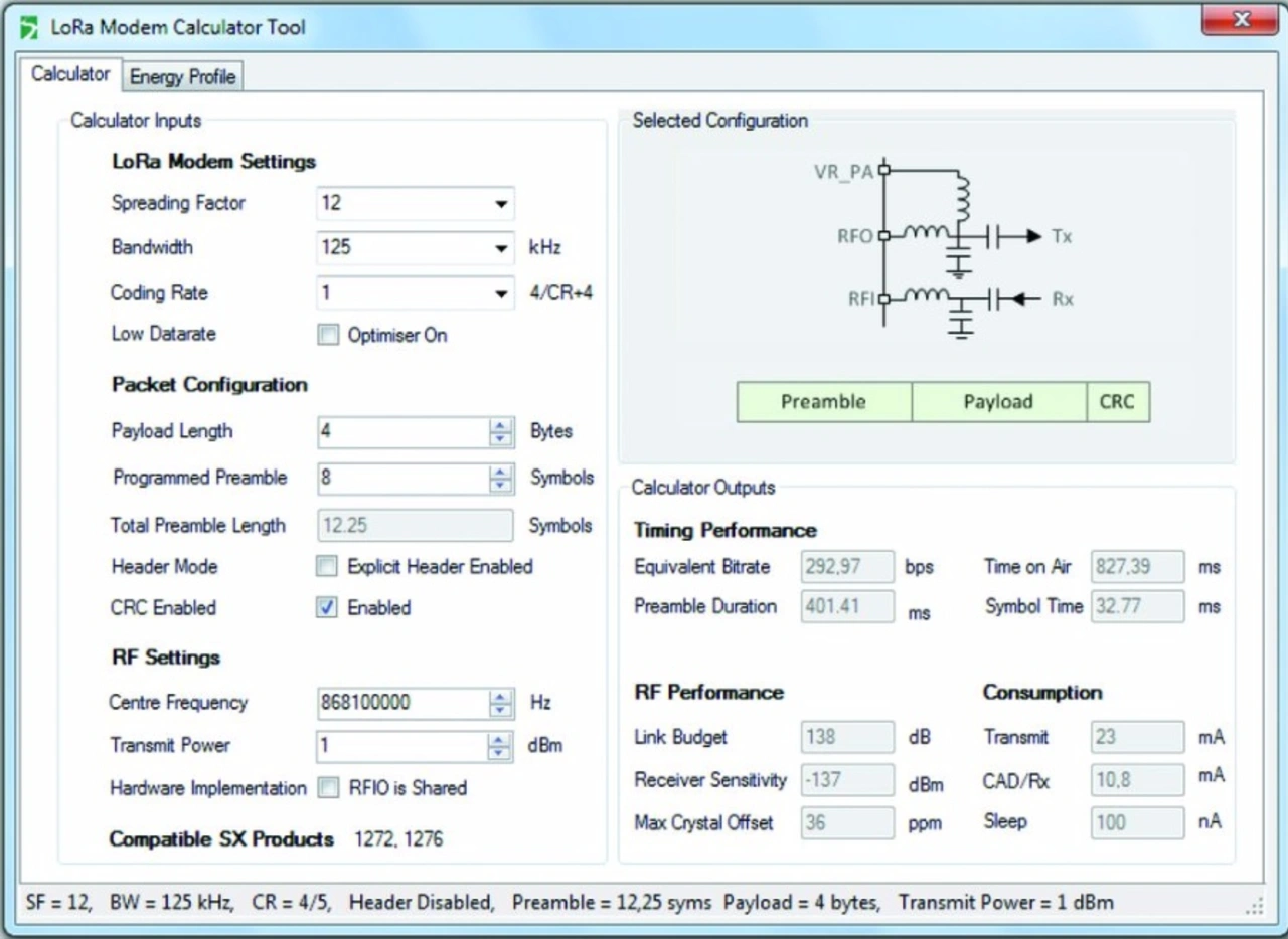Wegen der Vielzahl der möglichen Parameter lässt sich eine Funkstrecke im Hinblick auf Reichweite, Transferrate, Qualität der Datenübertragung und Strombedarf individuell anpassen. Dies muss sich letztlich in einer Umgebung mit der jeweiligen konkreten Anwendung beweisen. Als praktische Orientierungshilfe erweist sich das Programm »LoRa Modem Calculator« (Bild 5), mit dem sich verdeutlichen lässt, wie sich die Parameter auf das Timing, die HF-Leistung und die Stromaufnahme auswirken.