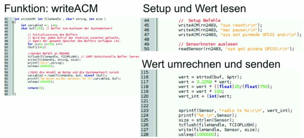 Bild 6 zeigt die wichtigen Codeabschnitte. Nach dem Setup wird der Sensorwert vom GPIO1-Pin gelesen und über »buf« in einen Temperaturwert umgerechnet, der daraufhin als »wert-int« über die LoRa-Funkstrecke versendet wird.