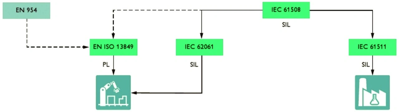 Neben der aktuellen Überarbeitung der Maschinenrichtlinie zur Maschinenverordnung befinden sich auch die beiden wichtigen Normen EN ISO 13849-1 und IEC 62061 in einem Anpassungsprozess. Während die Neufassung von EN 62061 bereits im Amtsblatt gelistet ist – für die Vorgängerversion läuft die Konformitätsvermutung Ende 2023 aus –, geht die Überarbeitung von EN ISO 13849-1 in die finale Phase. Eine positive Abstimmung hinsichtlich des FDIS (First Draft International Standard) vorausgesetzt, steht eine Veröffentlichung im Amtsblatt im Jahr 2023 aus. Trotz unterschiedlicher Herkunft sind beide Normen weiter zusammengerückt (Bild 4).