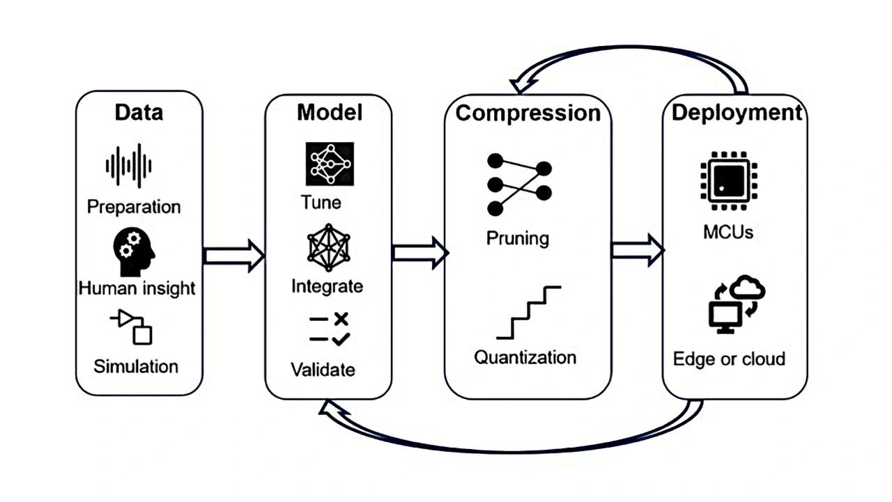 Generell umfasst ein TinyML-Workflow dieselben Schritte wie ein allgemeiner KI-Workflow: Erstens Datenerfassung und -aufbereitung, zweitens Auswahl des TinyML-Modelltyps, drittens Training des TinyML-Modells (üblicherweise nicht in der Zielhardware) und viertens Portieren des Algorithmus einschließlich des TinyML-Modells in die Zielhardware.