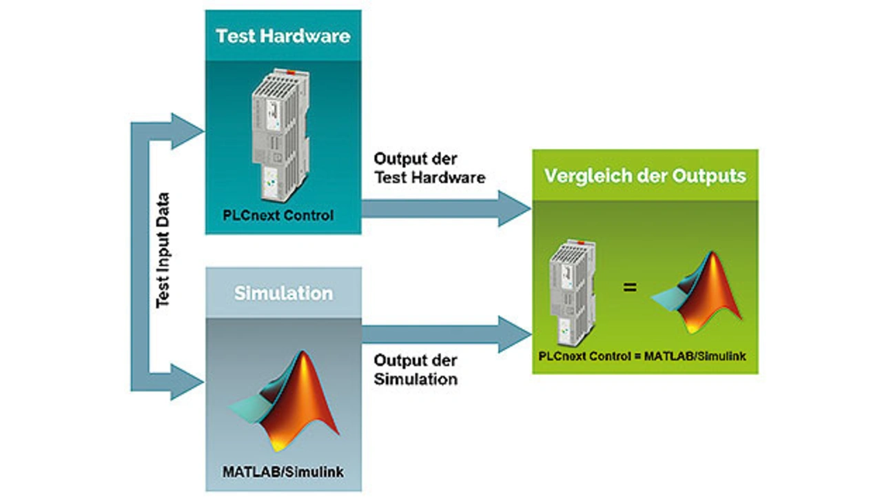Dabei wird das Modell zuerst lokal simuliert und die Inputs und Outputs werden aufgezeichnet. Anschließend lädt der Entwickler das Modell in die PLCnext-Steuerung, füttert es mit den in Simulink protokollierten Inputs und simuliert es in der Hardware. Danach lädt er die Output-Daten von der Steuerung herunter und vergleicht sie mit den Output-Daten der lokalen Simulation. Diese Tests lassen sich zusammen mit der Simulink Testbox verwenden und dort in bestehende Test-Cases integrieren. Darüber hinaus können die Test-Harnische von Simulink direkt für die HIL-Tests genutzt werden (Bild 1).