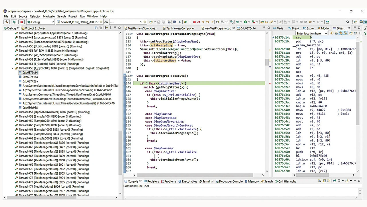Zur detaillierten Untersuchung des Modellverhaltens oder der Fehler ist es sinnvoll, die C/C++-Ebene zu betrachten. Beim Erstellen der PLCnext Library wird automatisch ein Eclipse-Projekt erzeugt, mit dessen Hilfe sich der generierte Code anpassen und neu bauen lässt – etwa um Log-Nachrichten einzufügen oder Fehler zu debuggen (Bild 3).