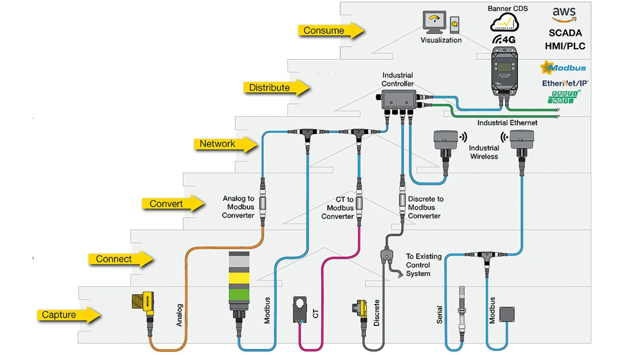 Nachfolgend wird kurz auf die Probleme bei der Anbindung von Altgeräten an das IIoT eingegangen. Anschließend wird die Architektur der Snap-Signal-Familie von Hardware- und Software-Tools des Herstellers Banner Engineering vorgestellt und erläutert, wie sie die Herausforderungen meistert. Vorgestellt werden Beispiele für Snap-Signal-Geräte, darunter der Controller DXMR90, sowie zugehörige Konverter, Adapter und Filter. Zudem werden mögliche Anwendungen bei der Implementierung von kabelgebundenem und drahtlosem Edge Computing oder der Cloud-Vernetzung erläutert.