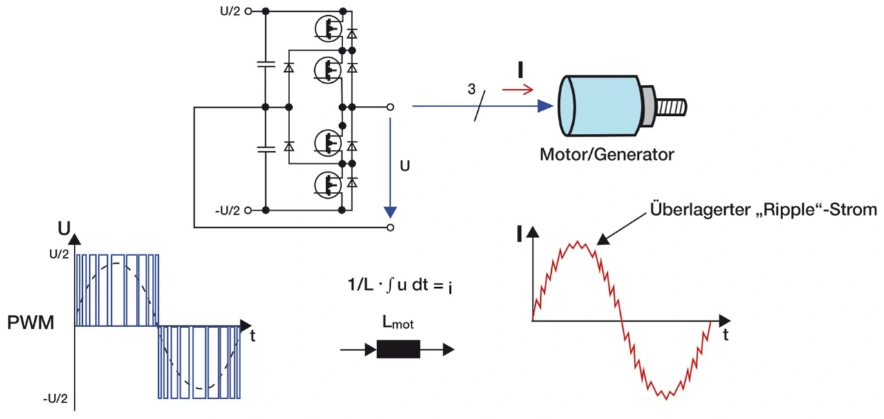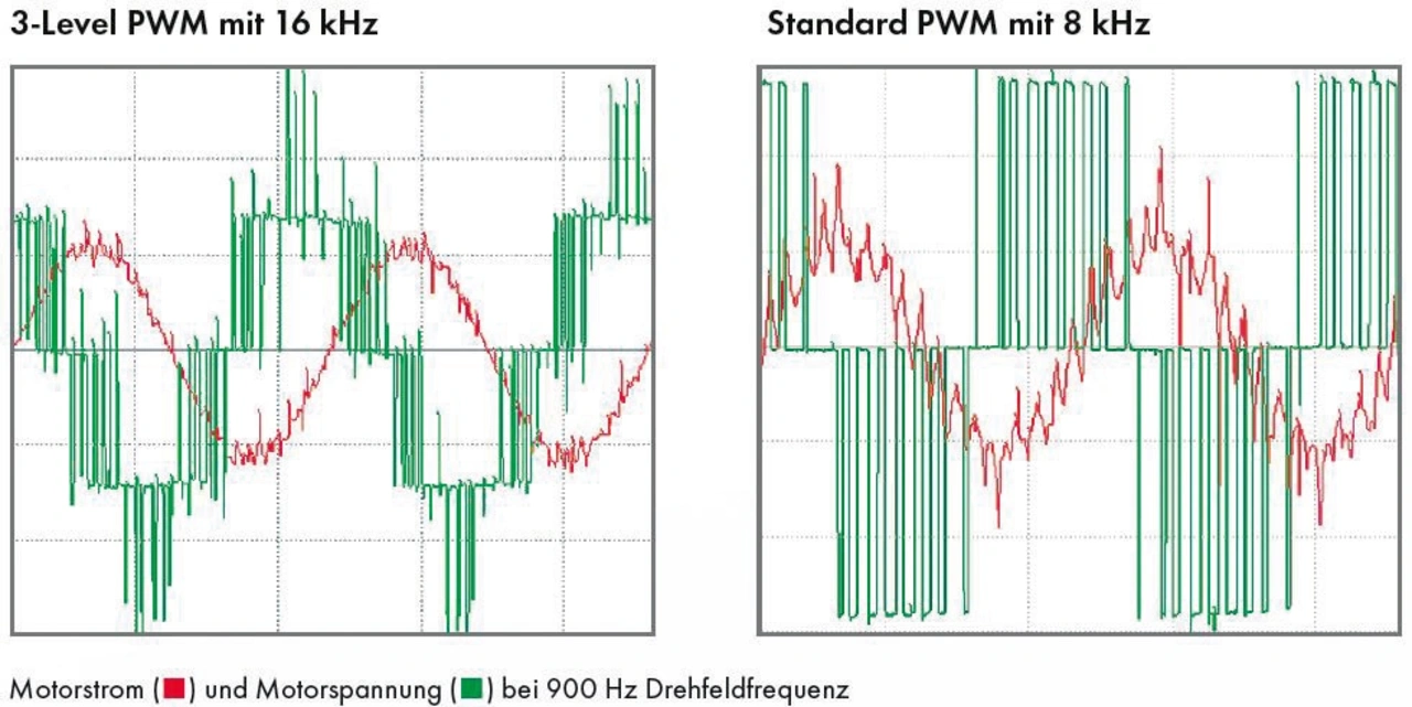 Entscheidenden Einfluss auf die Motorverluste hat neben der PWM-Schaltfrequenz auch der Spannungshub, der mit dem PWM-Muster auf die Motorwicklungen beaufschlagt wird. Er halbiert sich mit dem Einsatz der Drei-Level-Technologie, was in erster Näherung auch den Stromripple nochmals um die Hälfte verringert. Daraus resultieren wiederum wesentlich reduzierte Wärmeeinträge im Rotor. Bei gleicher PWM-Frequenz lassen sich durch Drei-Level-Umrichter die im Rotor entstehenden Verluste um bis zu 75 Prozent verringern. Entsprechend kann bei vielen Anwendungen auf Motorfilter oder Glättungsdrosseln zwischen Umrichter und Motor verzichtet werden. Dies verringert Gewicht, Platzbedarf und Kosten und erhöht den Gesamtwirkungsgrad.