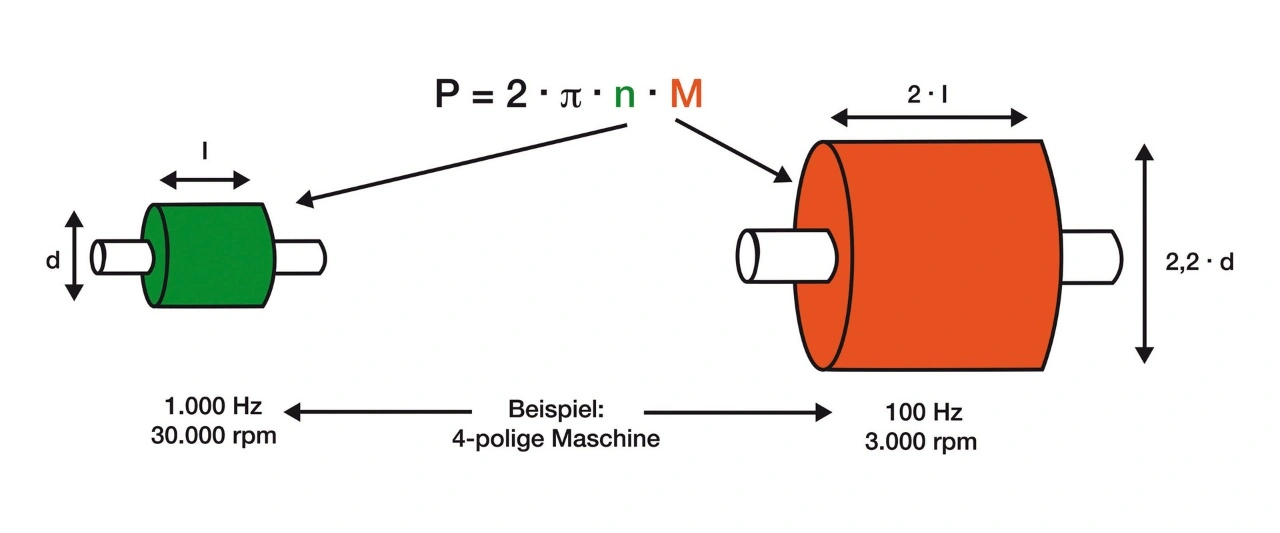 Auch das Motordesign muss an das anwendungsseitig benötigte Leistungs-/Drehzahlverhältnis angepasst werden. Dabei ist die zulässige Umfangsgeschwindigkeit des Rotors ebenso zu beachten wie die biegekritischen Frequenzen der zugehörigen Welle. Für einen Synchronmotor mit 100 kW bei 60.000 1/min bedeutet das beispielsweise, dass die benötigte Leistungsdichte nur mit einem vierpoligen Motordesign realisiert werden kann. Ein zweipoliges Design würde aufgrund der schlechteren Verteilung des magnetischen Feldes und der damit verbundenen unsymmetrischen Magnetausnutzung ein um das 1,5-Fache größeres Rotorvolumen erfordern. Allerdings wäre die daraus resultierende Wellenlänge aufgrund biegekritischer Frequenzen nicht realisierbar. Folglich ist für den Betrieb mit 60.000 1/min eine Drehfeldfrequenz von 2000 Hz anstatt von 1000 Hz erforderlich, was die Nutzung eines Hochgeschwindigkeitsumrichters notwendig macht.