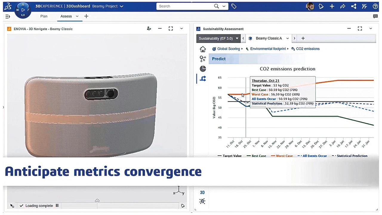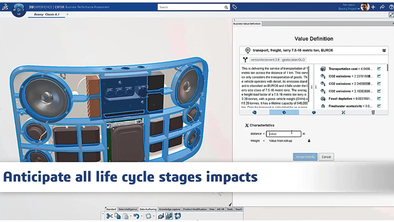 Die cloudbasierte Lösung ist vollständig in unsere 3DExperience-Plattform integriert und deckt die gesamte Wertschöpfungskette ab. Zudem greift sie auf die schon oben erwähnte Datenbasis von ecoinvent zu, die mehr als 18.000 Datensätze zu Auswirkungen industrieller und landwirtschaftlicher Prozesse umfasst. Sie integriert diese Daten in die Bereiche virtuelles Design, Produktentwicklung, Fertigungstechnik, Betrieb und Logistik.