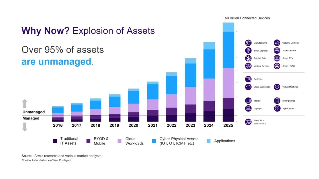 Innerhalb dieses Spektrums vernetzter physischer und virtueller Assets lassen sich zwei Hauptkategorien differenzieren – verwaltete und nicht verwaltete Assets. Verwaltete Assets, wie etwa Computer und Mobiltelefone, sind bereits mit einem administrierten Sicherheitsagenten ausgestattet. Nicht verwaltete Assets hingegen sind zwar mit dem Internet verbunden und agieren in Unternehmensnetzwerken, verfügen jedoch über keinen administrierten Sicherheitsagenten. Zu den nicht verwalteten Assets zählen beispielsweise industrielle Steuerungssysteme (ICS) wie SPSen und Gebäudemanagementsysteme (BMS) wie HVAC-Systeme, vernetzte physische Sicherheitsvorrichtungen und vieles mehr.