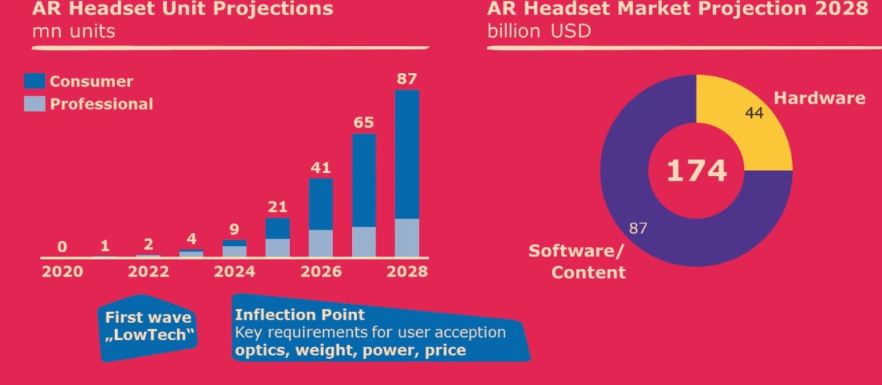 Was kann Merck also auf dem Gebiet der VR- und AR-Brillen beitragen? Wie schon angesprochen, müssen die Brillen deutlich leichter und kleiner werden. Heckmeier geht davon aus, dass sie von rund 500 g heute bis 2026 auf ein Gewicht von unter 100 g kommen werden. Gleichzeitig steigt die Größe des Blickfeldes, die Steuerung wird in den Brillen integriert sein und verschiedene Display-Typen werden zum Einsatz kommen.