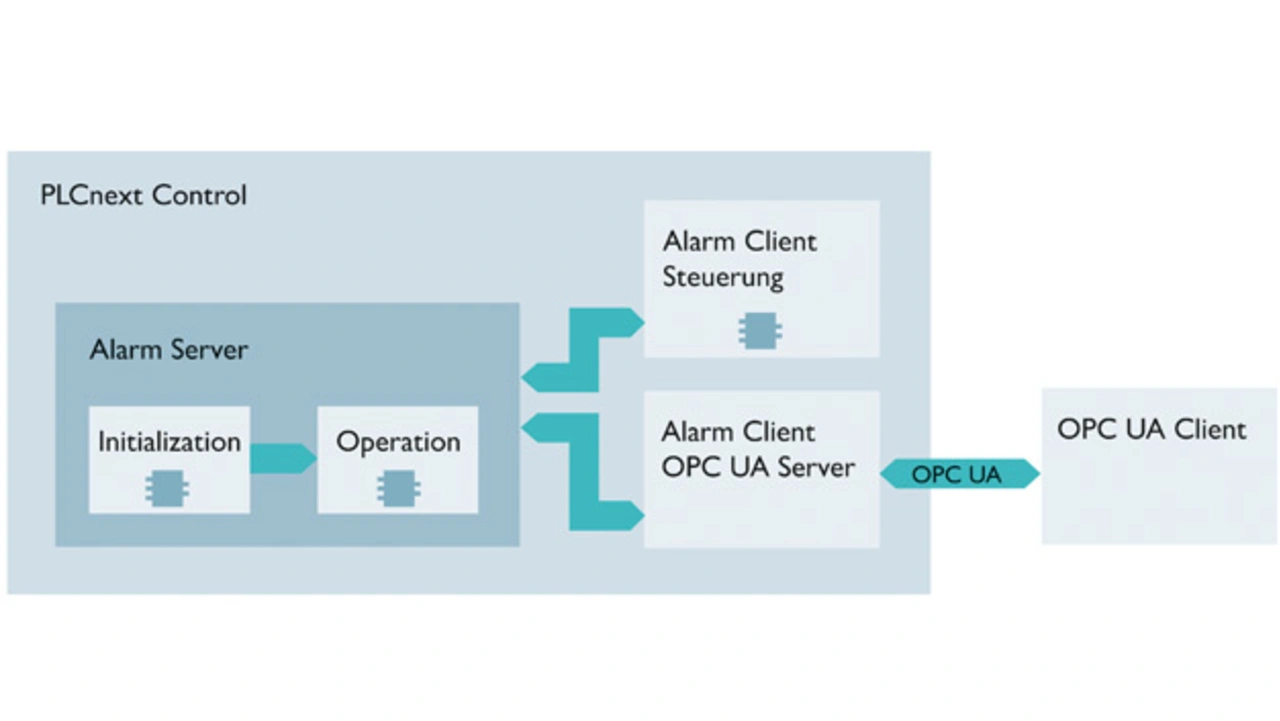 Als weitere wichtige Funktion der PLCnext-Controller erweist sich der eingebaute Alarm-/Event-Server. Er erlaubt, dass der Anwender aus dem Applikationsprogramm Alarme anlegen, aktivieren und quittieren kann. Die Applikation kennt den Status des Alarms in jedem Abarbeitungszyklus und kann darauf reagieren. Dies ist wiederum unabhängig von der gewählten Programmierumgebung – also IEC 61131 oder Hochsprache C++. Sofern der OPC-UA-Client dies beim OPC-UA-Server angemeldet hat, werden die Alarme dann über OPC UA weitergeleitet. Dabei lässt sich sogar der Alarmzeitpunkt durch die Applikation eintragen. Somit kann der Betreiber der Anlage den zyklusgenauen Ablauf einer Alarmkette leicht nachprüfen. Durch diese Flexibilität und den Kommunikationsstandard OPC UA erübrigen sich herstellerspezifische Alarmkonzepte (Bild 4).