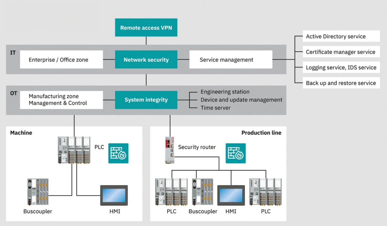 Die Levels 5 und 4 umfassen die IT-Systeme des Unternehmens sowie die Systeme für Fertigungsplanung und Logistik. Die Untergliederung des Netzwerks erfolgt durch Firewalls, sichere Gateways und VLANs. So lässt sich der Zugriff auf sensible Daten kontrollieren. Auf den Levels 3 und 2 befinden sich die Steuerungs-, SCADA- und spezifischen Prozesssteuerungssysteme. Die Segmentierung geschieht durch Firewalls und Profinet-Technologien, die VLAN-Priorisierung gemäß IEEE 802.1Q sowie eine Überwachung durch ein Intrusion Detection System (IDS). Die Levels 1 und 0 betreffen die Maschine oder eine Produktionslinie. Dort sind die direkten Steuerungssysteme, die Feldgeräte und die physischen Komponenten der Fertigungsprozesse installiert. Zur Untergliederung kommen eine physische Trennung, sichere Kommunikationsprotokolle und robuste Sicherheitsmechanismen zur Anwendung (Bild 1).