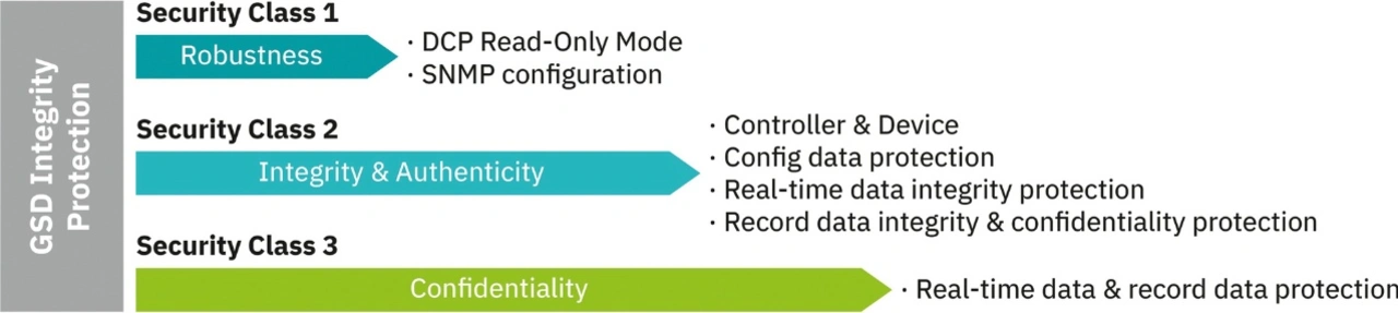 Die Profinet-Security-Spezifikation definiert drei Security-Klassen. Zur Steigerung der Security von Profinet-Netzwerken stellen Klassen unterschiedliche Schutzmaßnahmen zur Verfügung. Jede Klasse umfasst spezifische Security-Funktionen, die aufeinander aufbauen und so für einen umfassenden Schutz sorgen (Bild 2).
