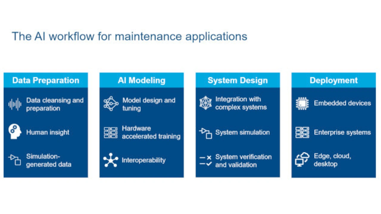 Mathworks unterscheidet im KI-Workflow für Predictive-Maintenance-Anwendungen zwischen vier Schritten. Der erste Schritt besteht in der Datenvorbereitung, ein Punkt, der laut Wallner oft vernachlässigt wird, obwohl dieser Schritt in der Praxis der anspruchsvollste ist und eine unabdingbare Grundvoraussetzung für eine erfolgreiche Umsetzung von Predictive Maintenance darstellt. Also gibt es domänenspezifische Apps beispielsweise für Bild- oder Textdaten, mit der Datensätze vorverarbeitet und gekennzeichnet werden können. Gibt es beispielsweise eine sehr große Menge von Daten, die natürlich nicht alle für eine Predictive-Maintenance-Anwendung relevant sind, können Anwender auf Tools zurückgreifen, die mithilfe von mathematischen Methoden analysieren, welche Daten wichtig und welche unwichtig sind. Wallner: »Im Prinzip handelt es sich hier um eine Empfindlichkeitsanalyse, mit der man herausfindet, welche Messdaten beispielsweise Auswirkungen auf einen Ausfall einer Anlage haben.« Liegen im Gegensatz dazu zu wenig Daten vor, können auch Simulationsgenerierte Daten erzeugt werden, um den Datensatz zu vervollständigen. Mathworks hilft außerdem dabei, die Daten automatisch zu kennzeichnen.
