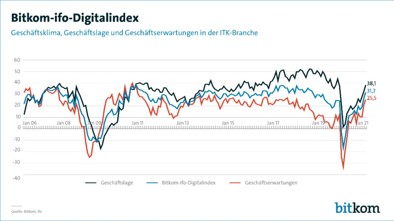 Im April stieg der Index für die aktuelle Geschäftslage um 5,6 auf 38,1 Punkte. Auch die Geschäftserwartungen für die kommenden sechs Monate verbessern sich um 4,6 auf 25,5 Punkte. Der Bitkom-ifo-Digitalindex, der sich aus der Einschätzung von Geschäftslage und Geschäftserwartungen berechnet, stieg im Vergleich zum Vormonat deutlich um 5,0 auf 31,7 Punkte. Er liegt damit höher als vor Beginn der Corona-Pandemie.