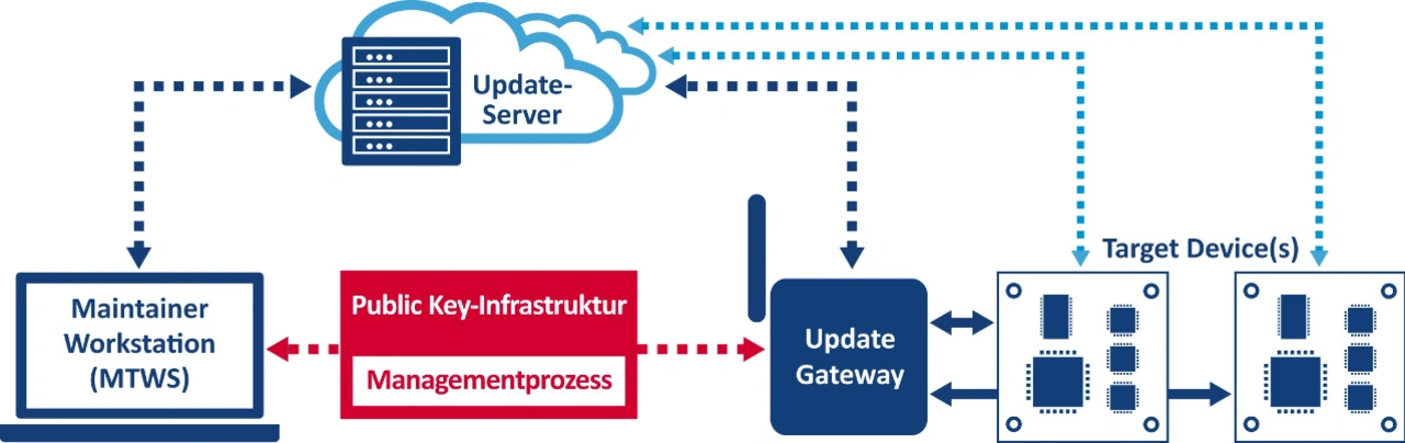 Aus kommunikationstechnischer Sicht sind der Erzeuger eines Software-Updates (z.B. der Maintainer einer Embedded-System-Firmware) und die eigentlichen Zielsysteme über ein IP-Netzwerk unterschiedlicher Ausdehnung und Komplexität miteinander verbunden. Vor Edge-Baugruppen oder in Automatisierungskomponenten eingebetteten Mikrocontrollern, die sich aus unterschiedlichen Gründen nicht direkt in eine solche Netzwerkinfrastruktur einbinden lassen, wird meist ein geeignetes (Update-)Gateway installiert. Es sorgt für die nötigen Protokoll- und Datenumwandlungen sowie die zwingend erforderliche Cybersecurity des jeweiligen Software-Update-Zielsystems. Schließlich müssen sowohl Authentizität als auch Integrität eines Software-Updates unter allen Umständen gewährleistet sein, bevor der neue Code erstmals ausgeführt wird.