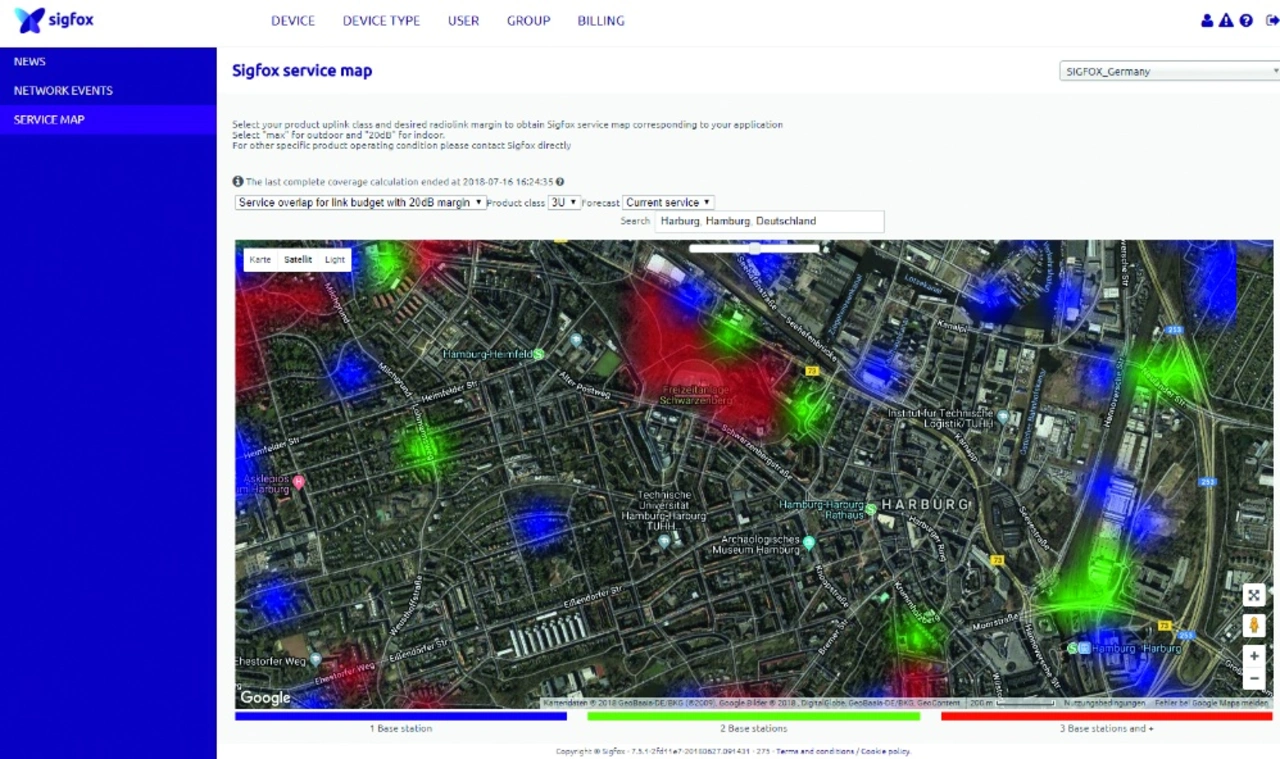 Diese Coverage-Karte ist eine Simulation im Außenbereich bei der man von einer Höhe von 1 m über dem freien Boden ausgeht, wobei Gebäude und Umwelteinflüsse nicht berücksichtigt werden. Laut dem Bild 2 gibt es im Süden von Hamburg demnach eine ganze Reihe von Sigfox-Basisstationen (Legende: blau = eine Basestation, grün = zwei, rot = drei oder mehr Basestationen). Tatsächlich befindet sich im gezeigten Ausschnitt aber nicht eine einzige. Sigfox ist allein für diese Basisstationen zuständig und im Raum Hamburg soll es insgesamt vier davon geben; wo sie genau lokalisiert sind, ist Betriebsgeheimnis und wird nicht preisgegeben.