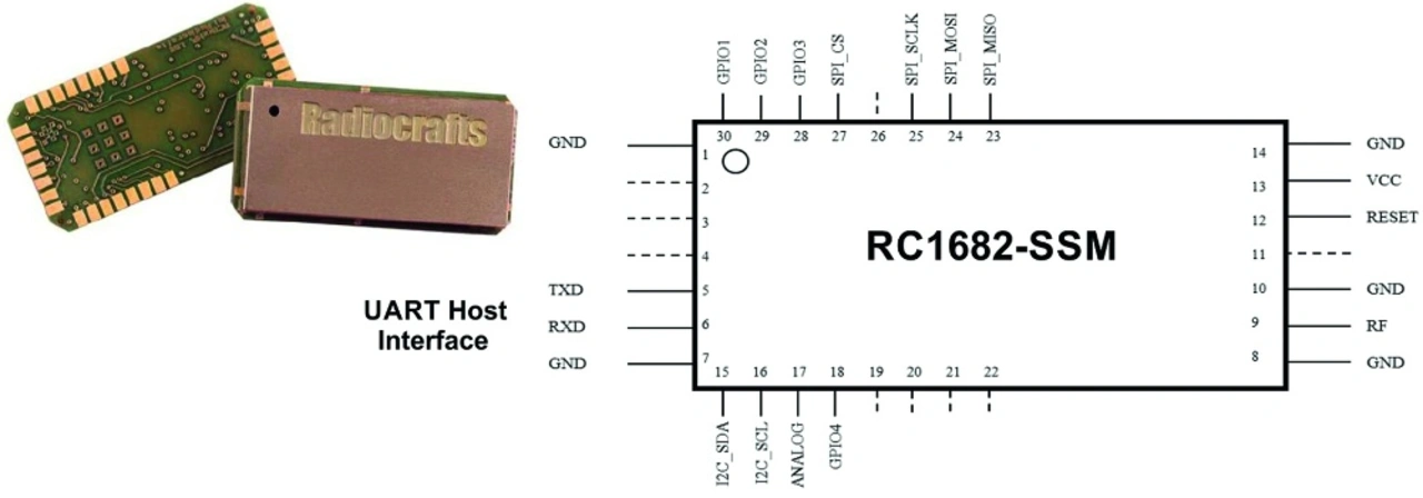 Die Sigfox-Module von Radiocrafts gibt es in vier verschiedenen Ausführungen: RC1682-SIG mit 868 MHz und das Modul RC1682-SSM, das demgegenüber zusätzliche Interfaces (analog, I²C, GPIO, SPI) – etwa für den Anschluss – von Sensoren besitzt, sodass es das Interessantere ist. Die Versionen RC1692 sind bei ansonsten gleicher Funktion für den Frequenzbereich 902/968 MHz (USA) vorgesehen.