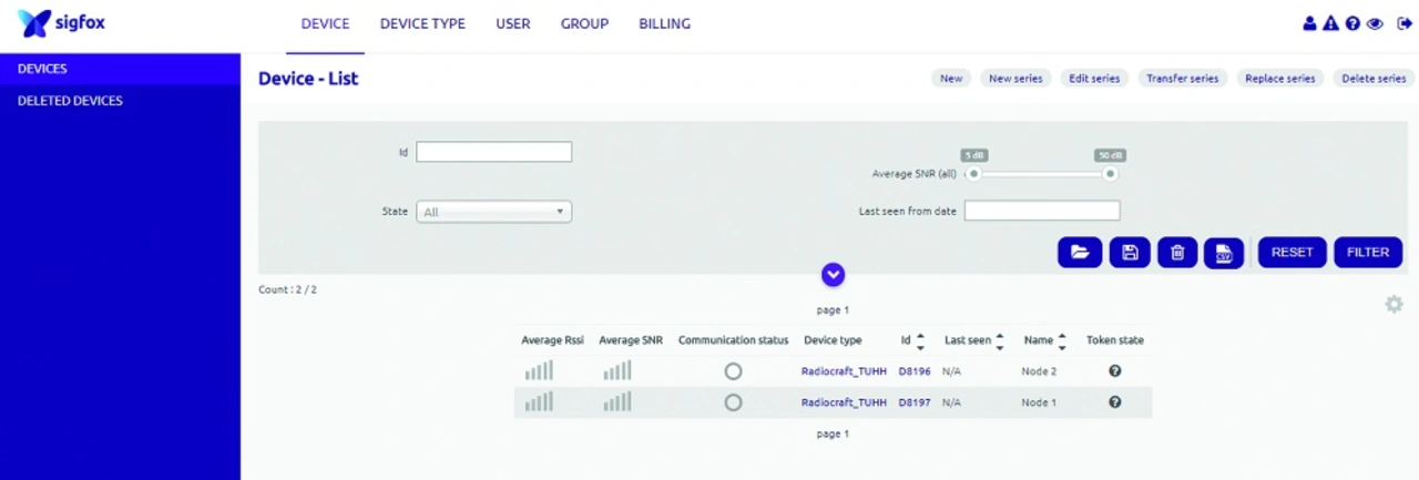 Die Registrierung der beiden Sigfox Devices konnte mit Unterstützung durch die deutsche Sigfox-Niederlassung erfolgreich absolviert werden (Bild 4), denn dabei sind doch einige Besonderheit zu beachten, etwa der Umstand, dass die PAC Number in umgekehrter Byte-Reihenfolge als auf dem Etikett abgedruckt, einzugeben ist oder aber dass das notwendige Product Certificate (das bei Sigfox für das Radiocrafts-System hinterlegt ist) eine völlig andere Bezeichnung hat als im Demonstration-Kit-Quick-Start-Dokument [4] von Radiocrafts angegeben.