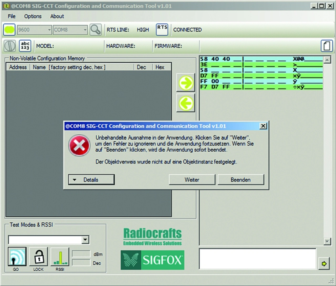 Immerhin sind zwei der Taster auf der Platine mit Reset und Config beschriftet und tatsächlich, wenn diese Config-Taste unmittelbar nach dem Aufruf der Baudrate-Autodetection betätigt wird, stellt sich die Baudrate ein und das Modul wird als Connected ausgewiesen. Das war es dann aber auch schon, denn die Anwahl des Configuration Modes resultiert in einem Timeout und dem Aufruf anderer Funktionen in einer Windows Exception (Bild 5), sodass man damit bereits am Ende des Tests angelangt ist.