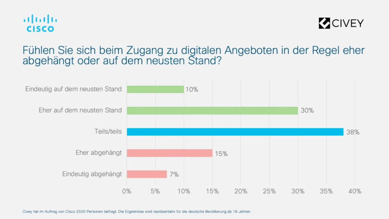 Technologie kann helfen, gerechtere Chancen für alle in unserer Gesellschaft zu ermöglichen. Der enormen Digitalisierungsschub des letzten Jahres kommt jedoch nicht allen zu gleichen Teilen zugute. Gerade im Bildungsbereich droht sonst eine sich bereits abzeichnende Mehr-Klassen-Gesellschaft: So fühlen sich 6 von 10 Befragten beim Zugang zu digitalen Angeboten nicht auf dem neuesten Stand. Besonders in den Bereichen Behörden und Verwaltung (38%), Bildung (35%) und Gesundheitswesen (23%) hätten sich die Deutschen in den letzten Monaten konkret bessere Angebote gewünscht.