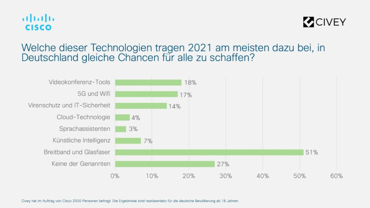 Die wichtigste Grundlage dafür ist jedoch eine gute technologische Infrastruktur. Das sehen auch die Deutschen so: Jeder zweite (51%) nennt Breitband und Glasfaser als entscheidende Voraussetzung für mehr Chancengleichheit. Auf den Plätzen dahinter folgen Videokonferenztools wie Webex (18%) sowie 5G und Wifi (17%). Damit sehen zwei Drittel der Befragten Netzwerkanbindung als Grundlage für gleiche Chancen auf Partizipation.