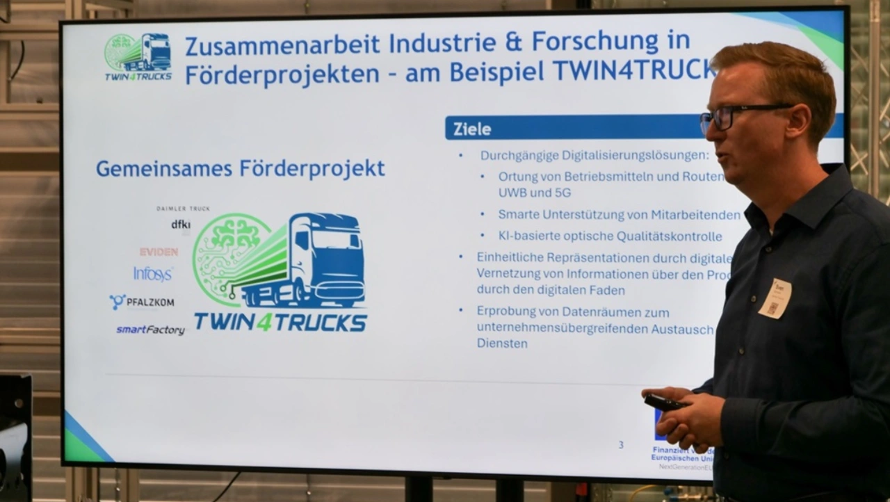 Möglich gemacht hat das ein Partnerkreis, dem neben Daimler Truck und dem Unternehmensverbund SmartFactory-KL auch das Deutsche Forschungszentrum für Künstliche Intelligenz (DFKI), Eviden, Infosys und die PFALZKOM angehören. Die Ergebnisse, die Christian Vollmer, Sven Karweik und Snehal Walunj vorstellten, begeistern auch das Publikum aus Industrie, Politik und Öffentlichkeit, das anlässlich des Innovationstags nach Kaiserslautern gekommen ist. Das Labor von SmartFactory-KL und DFKI dient als Testbed im Projekt, vor Ort ist ein Teil eines realen Lkw-Rahmenlängsträgers aufgebaut. In ihrer Demonstratorlandschaft, der Shared Production Kaiserslautern, produziert die SmartFactory-KL einen Miniatur-Lkw. 70 Kilometer südöstlich, in Wörth am Rhein, sind es dann die realen großen Fahrzeuge, deren Produktion von den Ergebnissen aus TWIN4TRUCKS profitiert.