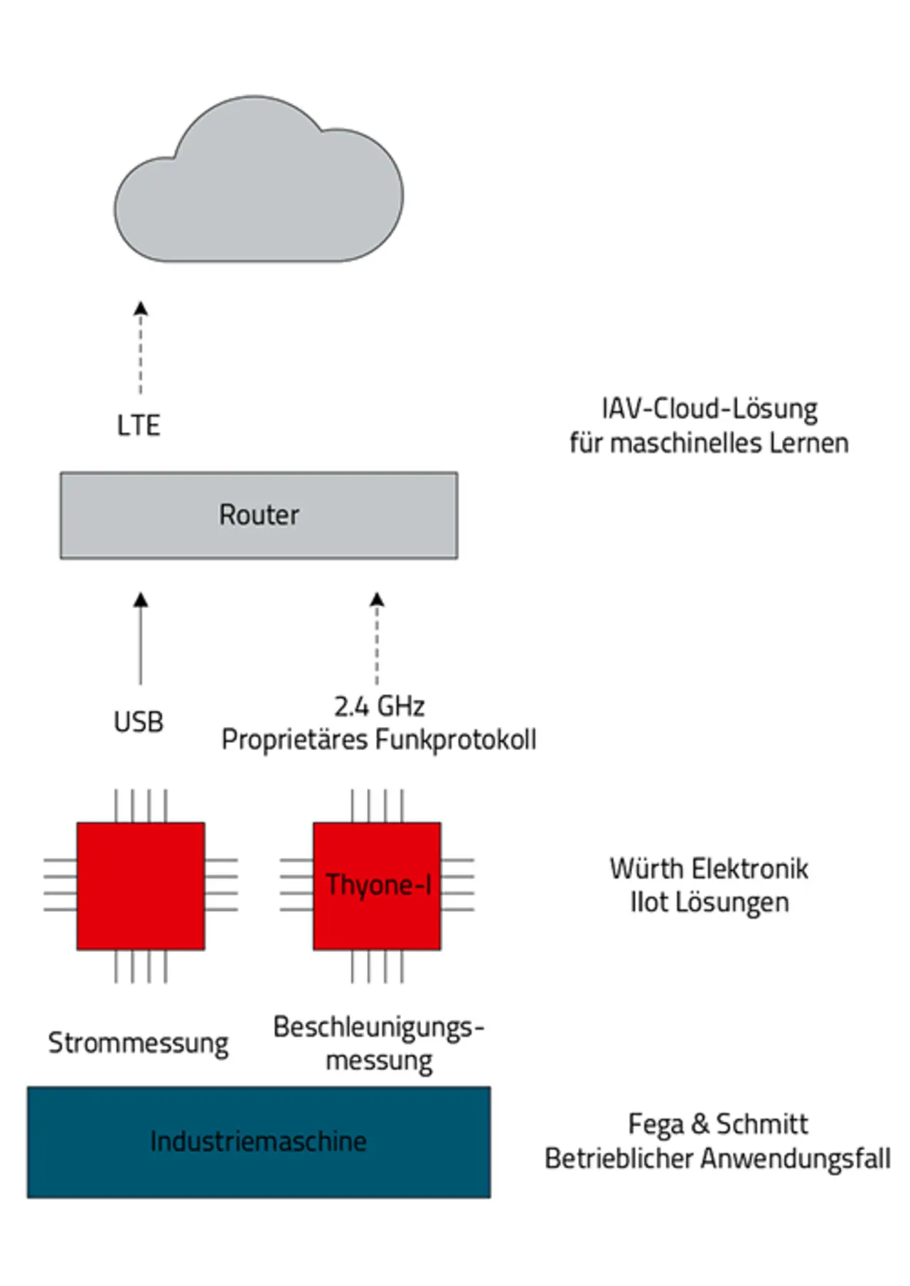 Würth Elektronik unterstützt dabei das Open-Source-Konzept und hat zusammen mit FEGA & Schmitt und IAV einen Proof-of-Concept für die Überwachung industrieller Schneidemaschinen realisiert (Bild 1). FEGA & Schmitt konzipierte dieses Projekt, Würth Elektronik lieferte die Vernetzung sowie die Sensorkomponenten und stellte zusammen mit IAV die Cloud-Infrastrukturlösung bereit (Bild 2). IAV bot zudem die Datenanalyse und vollständige Systemintegration an.