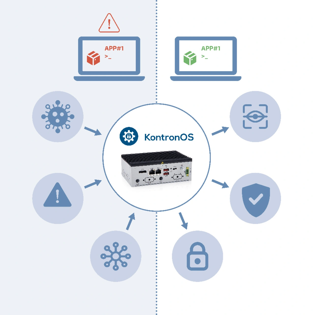 Zentraler Aspekt für alle Geräte und Maschinen, die im IoT (Internet of Things) verbunden sind, ist ein gehärtetes Betriebssystem. Unter dem Namen »KontronOS« steht sozusagen ein »Windows für Maschinen« zur Verfügung, mit dem bis Ende 2029 – so die Zielsetzung – 100 Millionen Geräte ausgestattet sein sollen. Die schlanke Konzeption auf Linux-Basis reduziert im Vergleich zu anderen Operating Systems potenzielle Einfallstore massiv, unter anderem sind alle Verbindungen komplett verschlüsselt, es wird nur digital signierte OS-Software wie etwa Updates ausgeführt, und Wartungszugriffe sind auf ein Minimum reduziert.