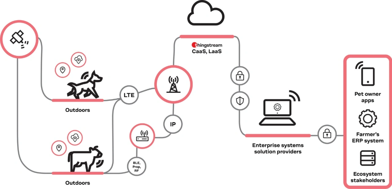 Tracker für Menschen, Haus- und Nutztiere: Bei ihnen handelt es sich meist um kleine, batteriebetriebene, am Körper getragene Geräte, die üblicherweise im Freien eingesetzt werden. Die genauen Anforderungen variieren zwar von Fall zu Fall, aber in der Regel bieten sie eine mittlere bis hohe Ortungsgenauigkeit mit einer mittleren bis hohen Häufigkeit der Positionsaktualisierung. Die Optimierung der Stromversorgung ist unerlässlich, um ein hohes Maß an Verfügbarkeit der Dienste zwischen den einzelnen Ladevorgängen zu gewährleisten. Weil die Tracker draußen unter wechselnden Umgebungsbedingungen eingesetzt werden, benötigen sie normalerweise eine IoT-SIM-Karte und eine Mobilfunkdatenverbindung, um Daten zurück in die Cloud zu übertragen.
