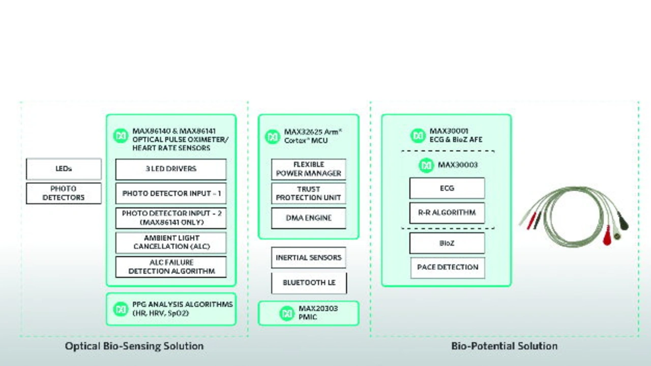 Im Gegensatz zu diesen beiden optischen Sensoren ist der MAX30001 ein Single-Channel-AFE zur Messung von Herzaktivitäten, Atmung und Bioimpedanz. Auch in diesem Fall betont Shieh, dass sich das IC von Maxim im Vergleich zu konkurrierenden Ansätzen durch folgende Punkte auszeichnet: Die Leistungsaufnahme und der Platzbedarf wurden um die Hälfte reduziert. Darüber hinaus zeichnet sich das AFE durch eine hohe Genauigkeit aus und entspricht den Vorgaben von IEC 60601-2-47 (für medizinische Geräte). Shieh: »Es gibt bereits einen Kunden, der unseren MAX30001 einsetzt und dessen Design hat bereits eine FDA-Zertifizierung erhalten.«