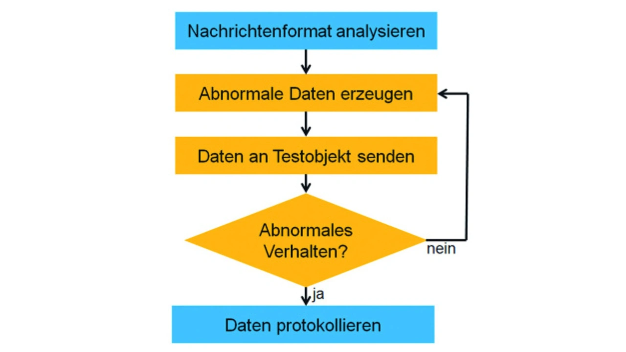 Bild 1 beschreibt den Ablauf eines Robustheitstests mittels Fuzzing. Zuerst ist das Nachrichtenformat zu ermitteln. Dann werden (zufällige) Nachrichten in diesem Format erzeugt und an das Testobjekt gesendet. Solange das Testobjekt normal reagiert (beispielsweise nicht abstürzt) werden weitere Nachrichten erzeugt und versandt. Ansonsten protokolliert der Monitor jene Nachricht, um das Fehlverhalten reproduzieren zu können. Ein solches Werkzeug zum Robustheitstest ist beSTORM. Es sendet Nachrichten an ein Testobjekt, wobei es eine Vielzahl von Protokollen unterstützt. Es benutzt Fuzzing, um die Nachrichteninhalte automatisch zu erzeugen.